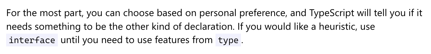 타입스크립트 핸드북에서도 확장이 용이해야한다는 프로그래밍 원칙에 따라 객체 타입 선언시 interface 사용을 권장하고있습니다.