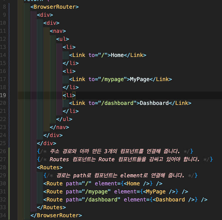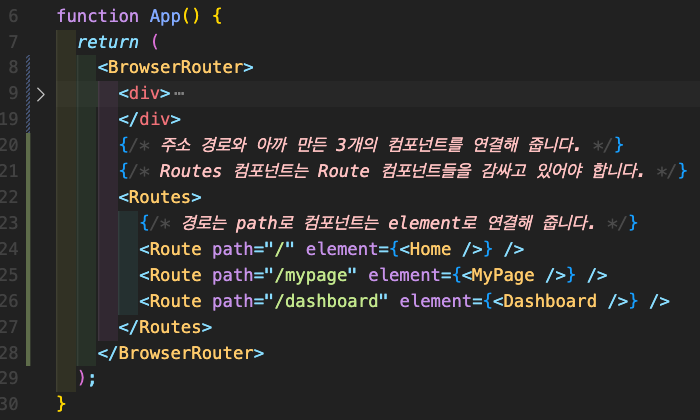👉🏻 Routes : Route 컴포넌트를 감싸서 그 중 경로가 일치하는 단 하나의 라우터만 렌더링 시켜주는 역할